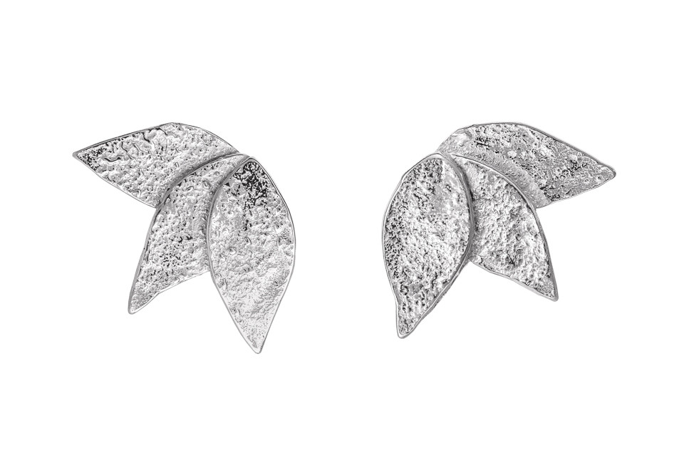 Kolczyki Kaliope to przylegające do ucha trzy listki wycięte, fakturowane i zlutowane w taki sposób, że wyglądają trochę jak promienie lub skrzydełka.